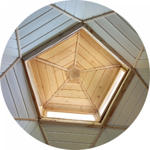 Je travaille par vidéo-conférence la plupart du temps depuis ce dôme géodésique, une structure géométrique en forme de demi-sphère formée de pentagones et d’hexagones formés à leur tour de triangles. Cet espace, entouré de nature, est propice à une profonde reconnexion intérieure pour les séances de libération émotionnelle.